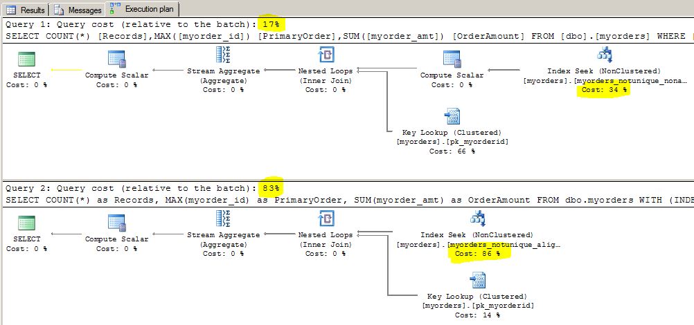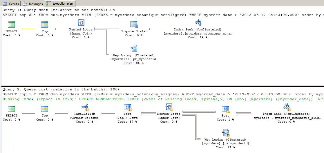 • Ok the example is a bit contrived as I am forcing the index, but even if you drop the non-aligned NC index myorders_notunique_nonaligned the SQL optimiser will choose to scan the table and wont use aligned NC index.  The difference is still a noticeable 813x slower!