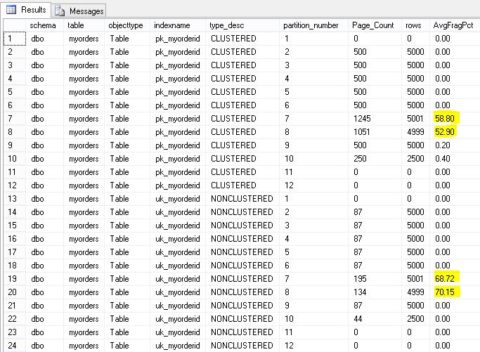 --REBUILD SINGLE PARTITION ALTER INDEX uk_myorderid ON dbo.myorders rebuild partition = 8 GO ALTER INDEX pk_myorderid ON dbo.myorders rebuild partition = 8 GO