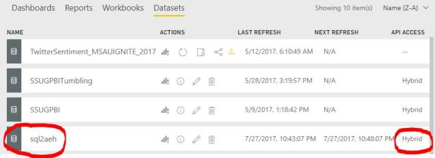 When you login to the Power BI Service you will now see a new dataset as created by Azure Stream Analytics. Note the type is HYBRID, which essentially means its of a streaming type.