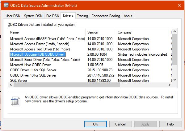 Once installed, when you open the ODBC client tool you should see the driver installed something like below. And, yes, yes, I know, its still called DocumentDB here!