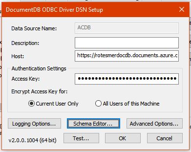 To do this we need to use the Schema Editor installed along with the Azure CosmosDB ODBC driver. You can read more about the process to do that here – https://docs.microsoft.com/en-us/azure/cosmos-db/odbc-driver#a-idcollection-mappingastep-3-create-a-schema-definition-using-the-collection-mapping-method