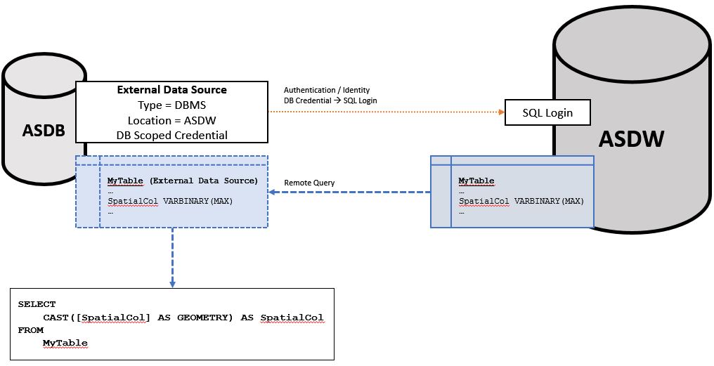 - Create an External Table in Azure SQL DB that “points” to the primary table in your existing Azure SQL DW (the one containing spatial data) using the External Data Source