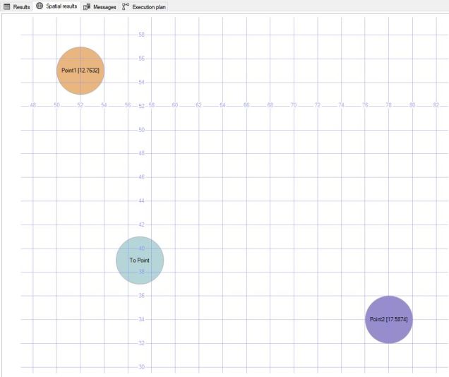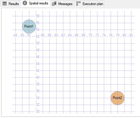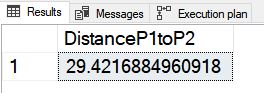 DECLARE @g GEOMETRY; DECLARE @g2 GEOMETRY; SELECT @g = PolyVarBin FROM [dbo].PolyTable WHERE [PolyName] = 'Point1'; SELECT @g2 = PolyVarBin FROM [dbo].PolyTable WHERE [PolyName] = 'Point2'; select @g.STDistance(@g2) as DistanceP1toP2;